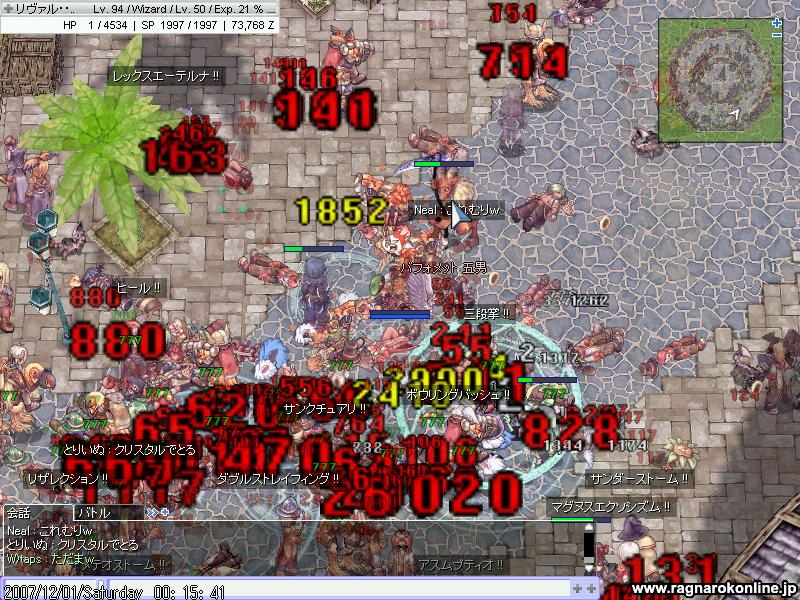 これはひどいwww とりあえず生体3モブ引き連れてくるのはずるいぜバフォ様。。。w とりあえずエフェ切らないと全く動かないので切ったはいいけど大魔法が全く見えないので気が付いたら赤い数字の波にのまれて南無ってた、、w RO初めて1年半くらいだけど1日でここまで死んだのは初だなw